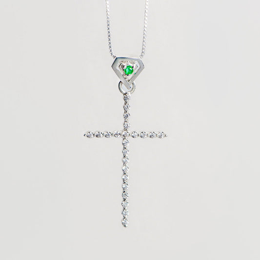 Sterling Silver Pave Cross Necklace With Colombian Emerald