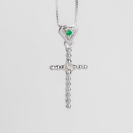 Sterling Silver Ball Beaded Cross Necklace with Natural Emerald